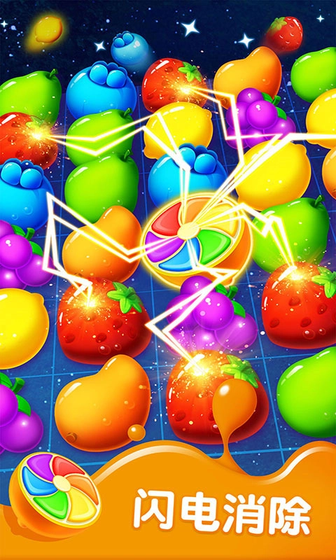 消除时会触发果汁飞溅的特效,要是形成了大规模的连击或者消除组合,还能触发全屏消除的效果。
