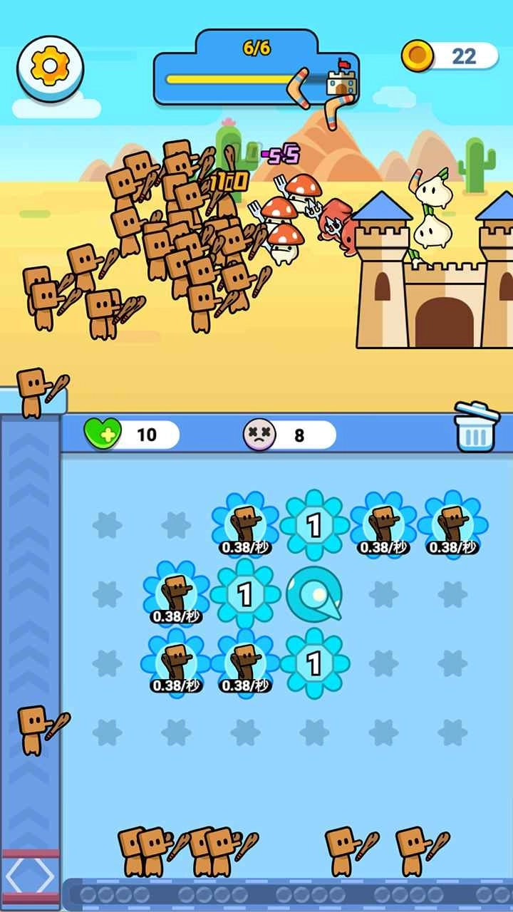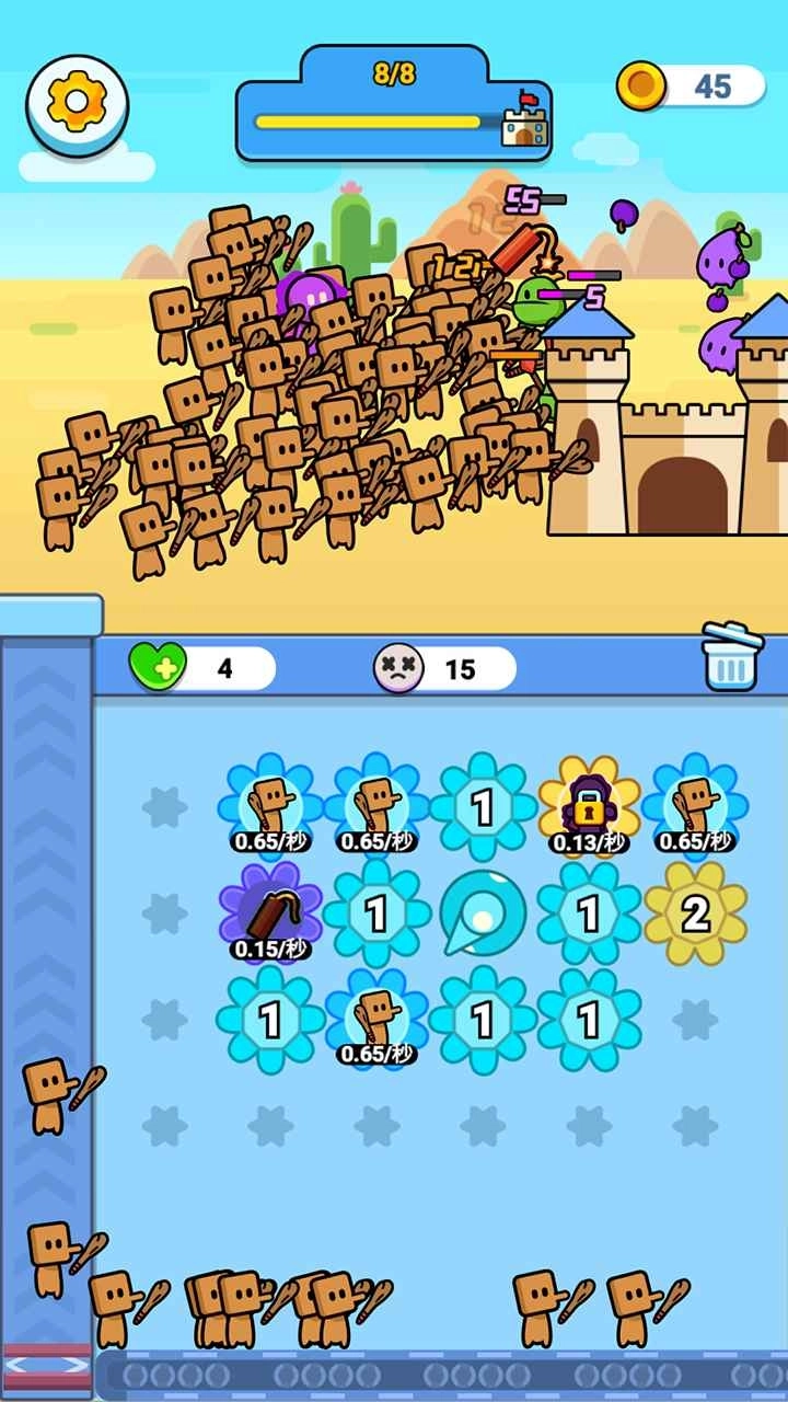 3、借助齿轮合成的方式推动效率提升,解锁全新兵种并对现有单位的等级进行升级,与此同时为小兵配备技能道具来增强其战斗能力。
