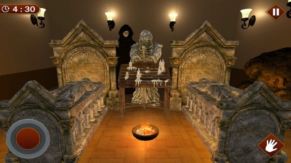 手持镰刀的骷髅死神降临了,地上躺着个晕倒的人,不知是死是活。玩家得先顾好自己——这房间里藏着不少隐蔽角落,找个死神察觉不到的地方躲起来才是要紧事。