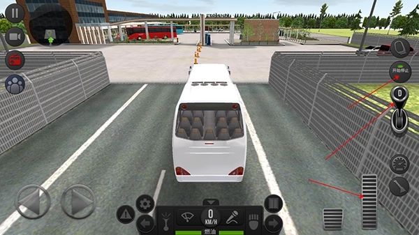 4、进入游戏后,我们需要驾驶公交车,通过点击图中所示的启动停止键、换挡杆和加速按钮来启动公交车!
