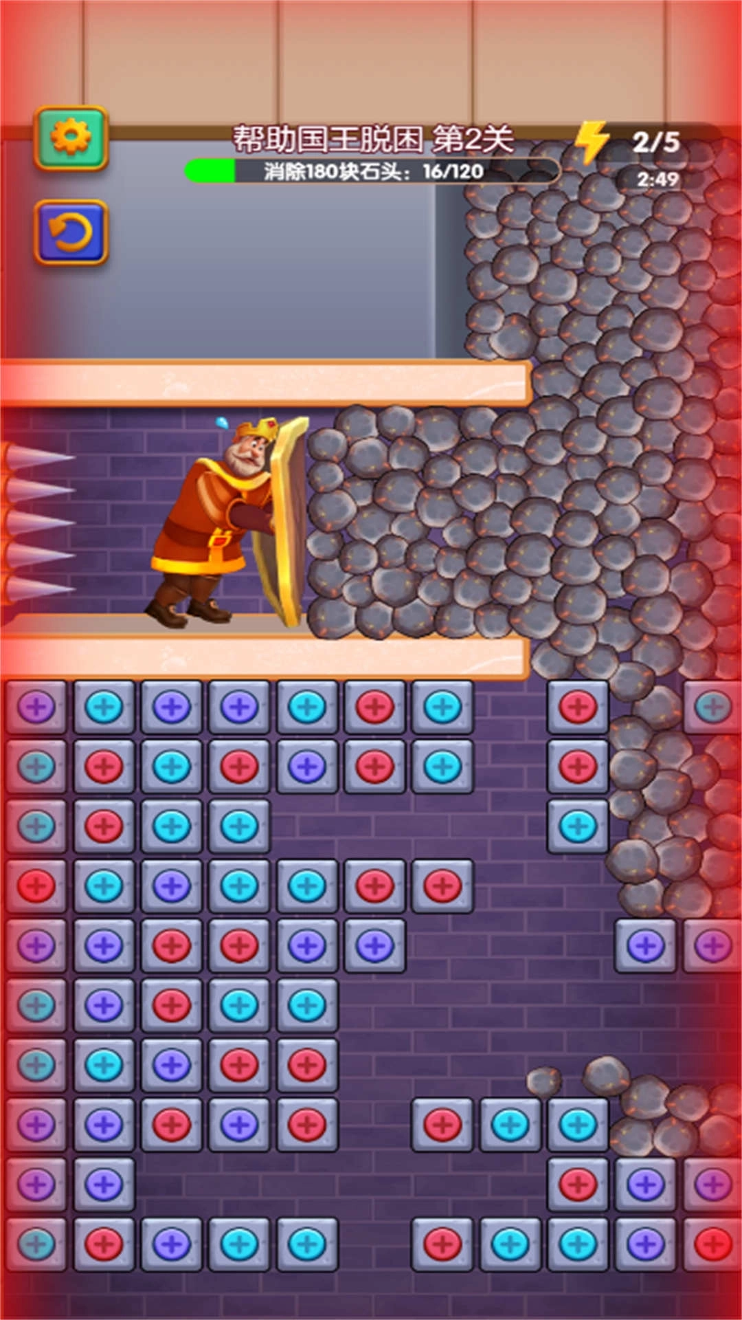 3、在石头即将压到国王之前,要优先消除上方的螺丝,以此快速转移石头,保障国王的安全。
