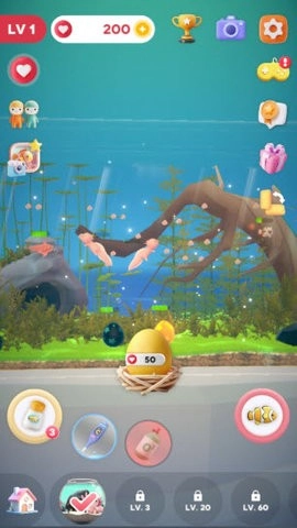 1、轻触屏幕,相同的鱼苗就能合成新鱼苗,不同种类的鱼儿则会给玩家带来不一样的收益。
