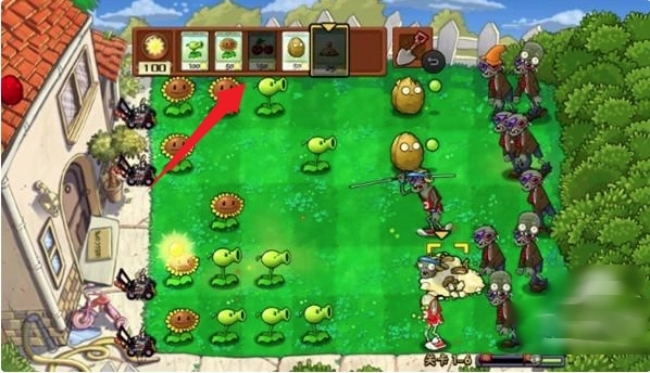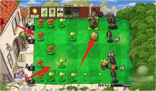 3.僵尸来势汹汹,搭建防线迫在眉睫。坚果充当坚实屏障放在最前面,给后排植物争取应对时间;向日葵种在最后方,全力确保阳光的持续供应;中间位置则安排豌豆射手这类输出型植物,构建起稳固的攻击阵列。