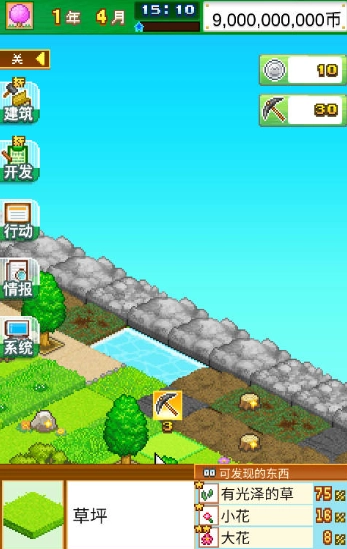 1、游戏进行一段时间后就可以获得“铁镐”,通过挖掘草地和未知区域,可以获得不同的道具素材。