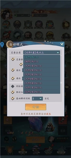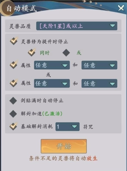 ②回到主界面,打开自动模式,把【灵兽品质】选择到【[地阶]或以上】,然后开启自动解封;