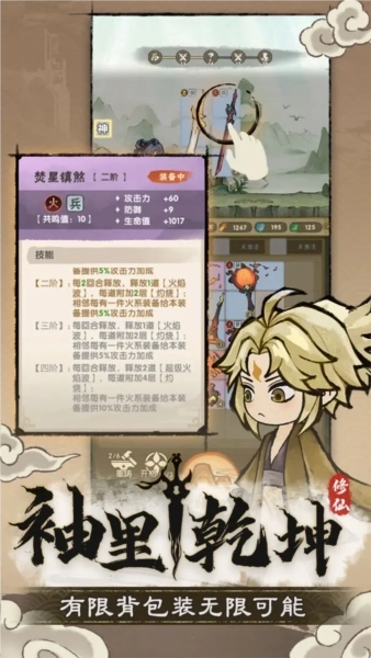 2、进入关卡后玩家可以将各种法宝放入弟子背包来提升战斗力。