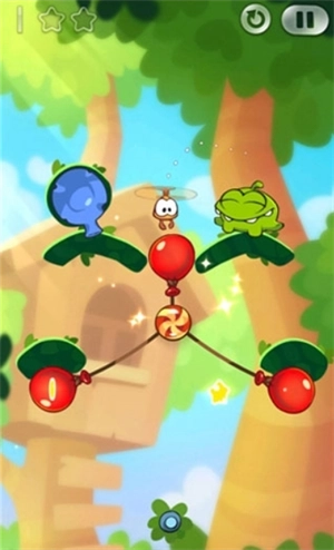 4、戳破右侧的气球,借助力的作用让糖果摆动到左边,从而吃到最后一颗星星。