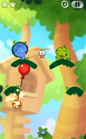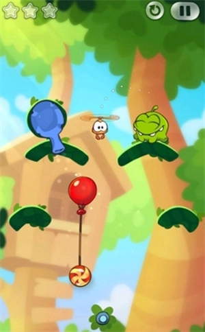 2、扎破最顶端的气球,借助糖果下落产生的力量,牵引下方两个气球脱离原来的位置,向上飘升。