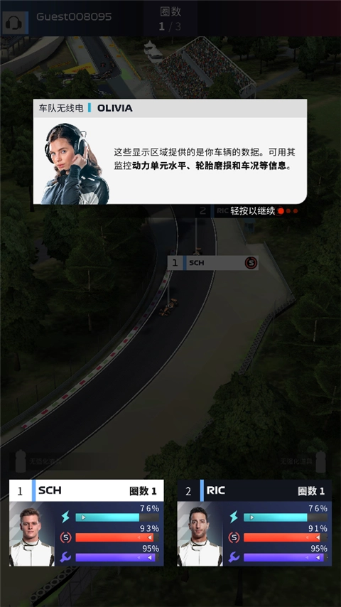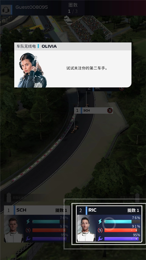 3、接着进入比赛,画面中出现玩家的两位车手。在比赛过程中,玩家能够对这两位车手进行管理。