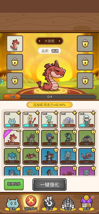 通过关卡“普通1-5”后,商城功能将正式解锁。在商城里,我们可以进行装备召唤,随着召唤次数的累积,召唤池等级会逐步提升,等级越高,获得高品质装备的概率也会相应增加。此外,商城还提供技能与伙伴的召唤选项,每解锁一项新能力,都能为我们带来显著的战力提升,不过这些功能需要通过完成主线任务和特定关卡来开启。游戏系统会自动对比玩家当前装备的增益数值,当有增益更高的装备时,会以红点提示玩家及时更换。在游戏前期,建议优先提升攻击力,这样能更高效地通关和推进主线,同时解锁小怪兽的各类能力,助力我们快速成长!