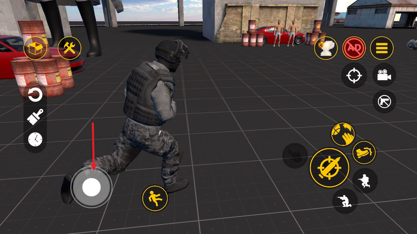 进入游戏后,可借助左侧的摇杆操控人物移动,右侧分布着开枪、跳跃、拾取等功能按键。