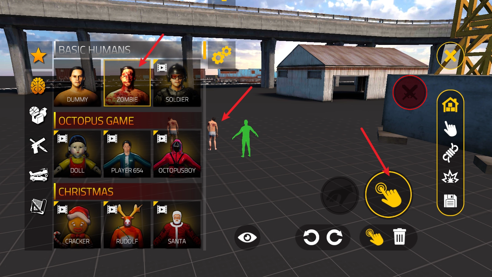 接下来我们点击左上角的盒子,在这里能够开展沙盒世界的搭建工作。例如若想召唤僵尸,只需选中对应的角色,再将绿色光标移动到恰当的位置,点击右侧的按钮就能完成放置操作。