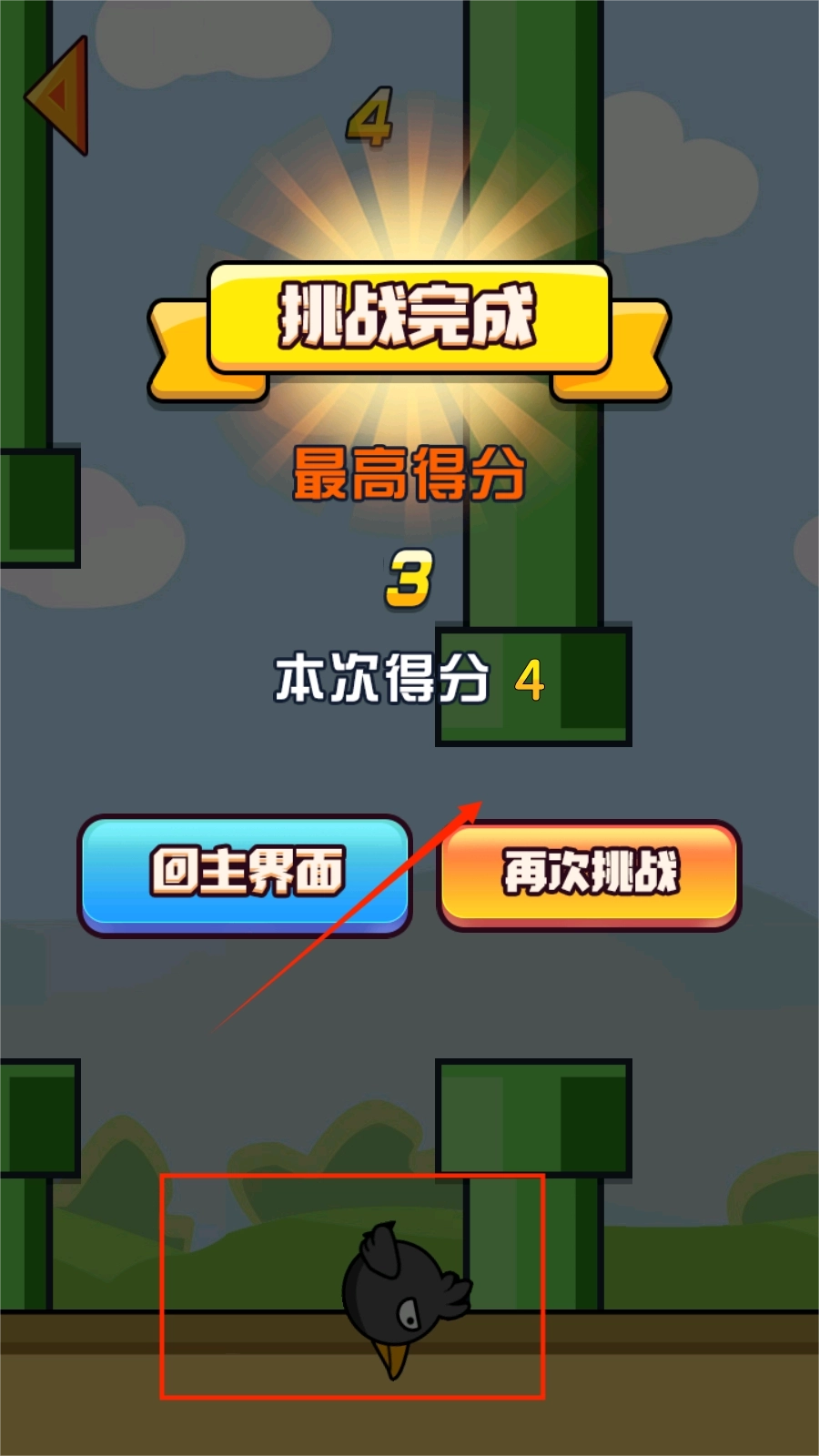 2、通过控制小鸟上下跳动穿过障碍物,掉落或者碰到障碍物游戏均会失败。