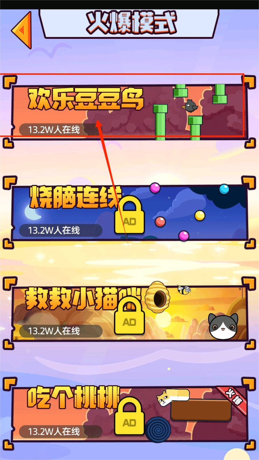 1、进入游戏后,有多种模式可以选择,选择感兴趣的模式后,进入挑战界面,可以选择欢乐豆豆鸟。