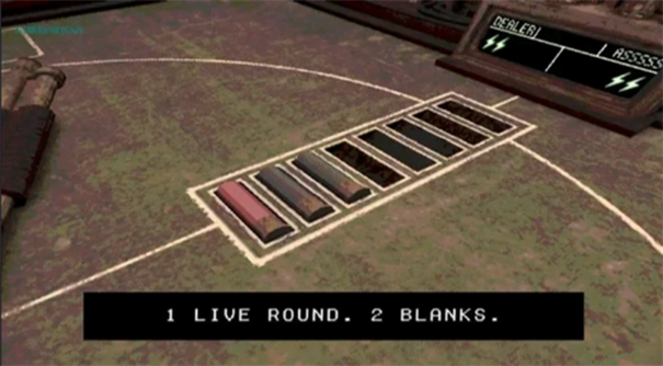 5、在我方回合,可选择向对方或自己开枪。若选择向自己开枪,扣动扳机后若安然无恙,即可额外获得一次开枪机会;若选择向对方开枪且安然无恙,则会停滞一回合。最终,血条先归零的一方将出局。