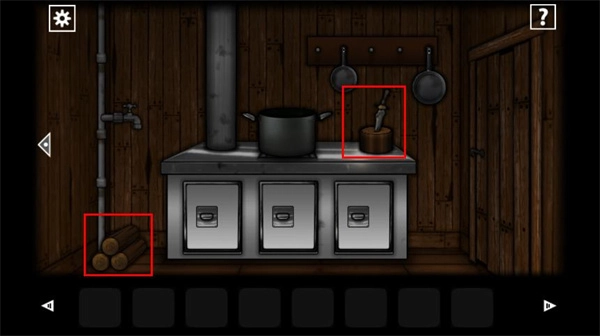 2、走出去到厨房,在左下角位置拿到木柴,再从右上方的砧板上拿到刀。