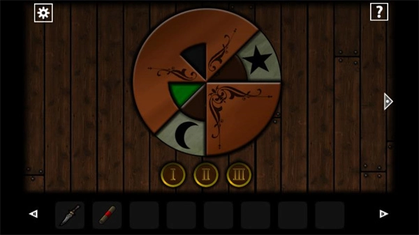 8、进入带有旋转转盘的房间后,点击墙上的转盘,按照图示调整至对应图案,调整完成后,后方的门即可开启。