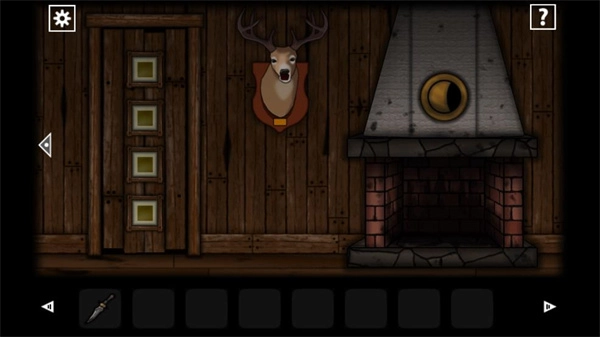 3、拿到钥匙后回到最初的房间,用刚拿到的钥匙打开柜子,柜子上有个小游戏,调整后能获得重要提示。接着前往鹿头所在的房间,利用刚才得到的提示打开左边上方的门。