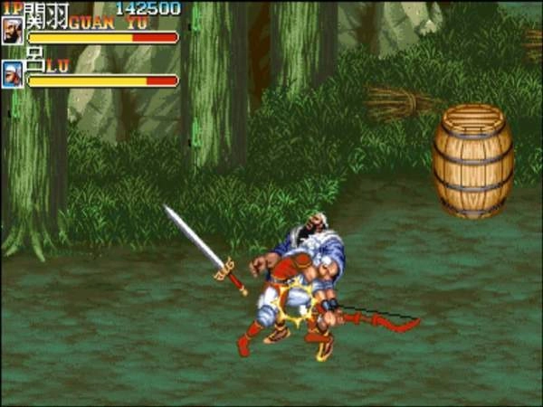 10、最终Boss战:敌方主将是曹操,他会使用炸弹进行攻击。这场战斗的时长只有15秒,15秒过后曹操就会逃离战场。在战斗开始前,玩家可以选择“释放”选项,直接让曹操离开(不过世界版和美版的游戏里没有“释放”这个选项)。根据战斗的不同结果,结局画面也有所区别:如果成功打倒曹操,结局是统一全国;选择释放曹操,结局则是三国鼎立;要是曹操在15秒内逃走了,就会显示五位主角最终战死,曹操一统天下的画面。