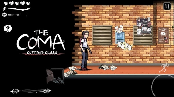 看到宋老师像疯了一样举着刀冲过来,我完全不知道发生了什么,但当下肯定得先保住小命。我赶紧往右边拼命跑,一直跑到尽头钻进男厕所,躲进了最里面的那间隔间里。(你左上角的五颗心就是血量,要是全没了就GameOver!)