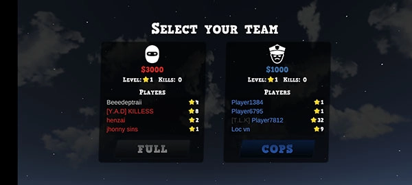 3、进入房间后,可依据当前对局情况选择加入警察方或罪犯方,系统会动态平衡双方人数,以确保竞技的公平性。