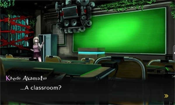 1. 游戏破天荒地引入“说谎”系统,玩家在学级裁判时,能够凭借说谎来诱导对手露出破绽。此作的舞台和第一部类似,同样是一所被封锁的学校,名为“才囚学园”。这里展示了才囚学园教室的场景,室内的天井和墙壁上都生长着植物,再搭配上昏暗的照明,营造出一种仿若废墟的氛围。