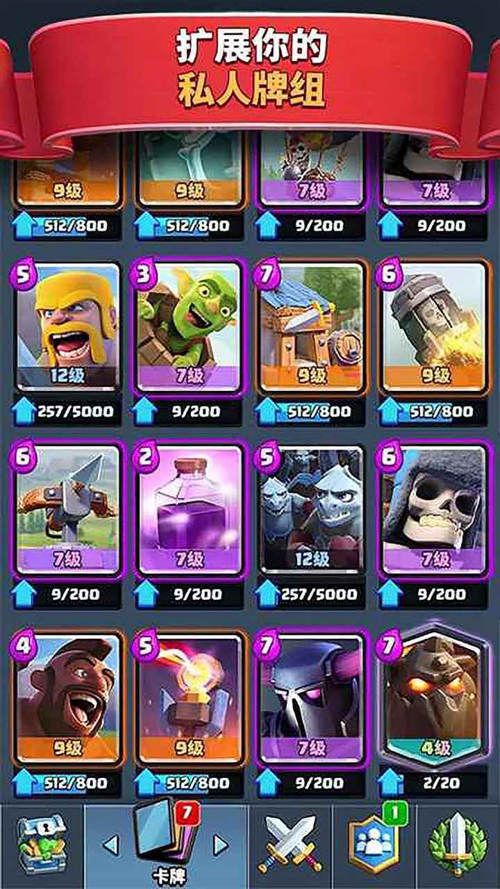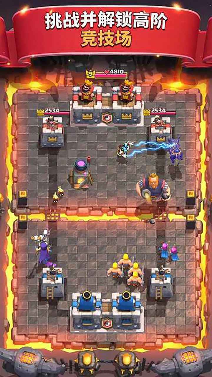 构建并提升您的卡牌收藏,涵盖《Clash Royale》中的皇室成员,以及数十种源自《部落冲突》的部队、法术与防御设施。
