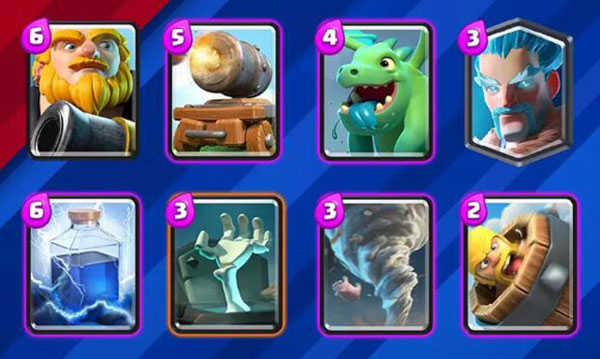 3、这套皇家巨卡组属于慢速卡组,其核心策略就如同跟对手打太极一般。除了皇家巨这一唯一核心卡牌外,冰法、飞龙和炮车都是血量较为厚实的防守利器,再搭配墓碑以及3张法术牌,能够构建起坚不可摧的防线。将皇家巨沉底放置,可以迫使对手出牌,打乱他们的出牌顺序。当第二个皇家巨避开对手关键解牌时,就能配合后排卡牌进行返场,进而实现一波爆发性进攻。炮车这张牌也可以替换成更为稳健的蓝胖,而大电同样能用火球来替代。