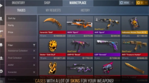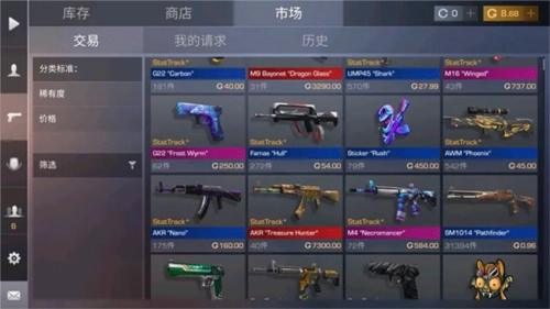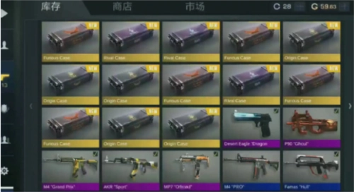 市场是供玩家彼此交易各自游戏皮肤的场所。游戏皮肤分为白、浅蓝、深蓝、紫、粉、红这些等级,且遵循颜色越深价格越高的规律。