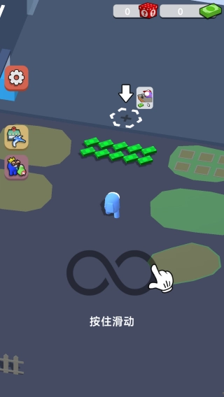 2、包含“按住滑动”这类操作指引,游戏中存在金币、道具(像骰子、建筑类图标)等元素,游戏类型属于模拟经营或休闲建造类。