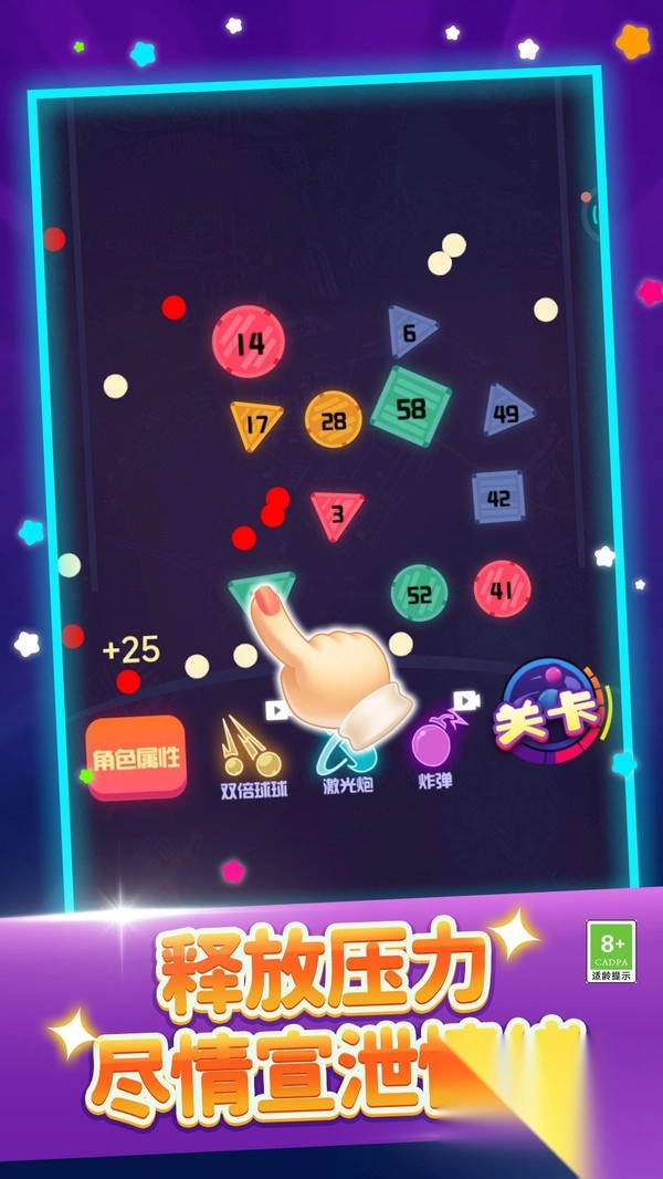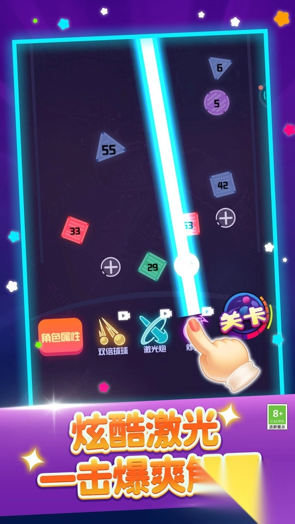 在关卡中收集诸如双倍球、激光发射器之类的辅助物品,通过点击来激活它们,以此提升弹射的冲击力,从而更高效地清除屏幕上的目标。