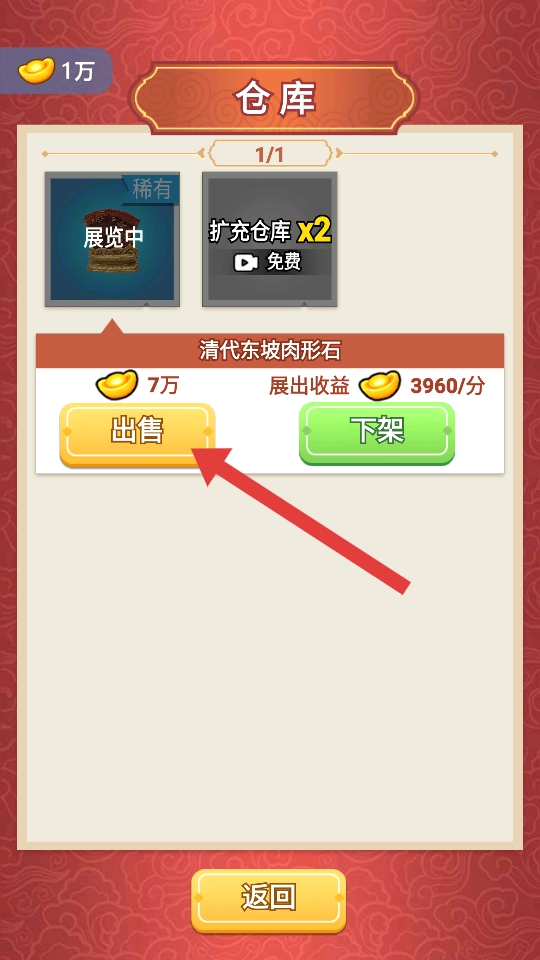 处理完毕的古董可移至仓库界面进行管理,若希望获得收益,可点击对应古董的出售按钮,按照当前市场行情将其卖出,从而获取游戏内的货币。