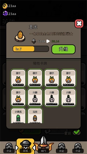 点击下方的英雄按钮能够召唤出各式各样的水果,召唤完成后,你既可以选择让它们上阵参战,也可以用它们来强化其他水果。