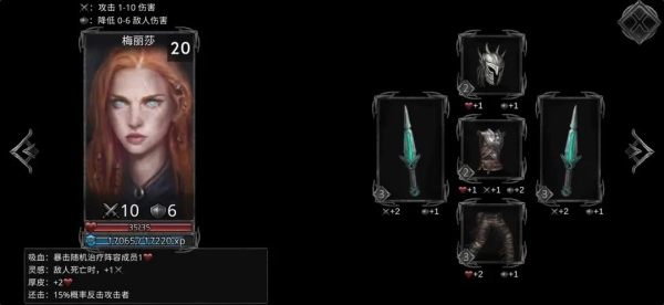 第五个盲女,身板肉,具备战斗能力,打出暴击时可为队友恢复生命值,培养方向优先选择护甲和攻击属性。