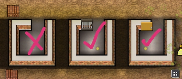 房间布局:牢房的布局需合理规划,单人牢房的开口一侧建议朝向大门,便于狱警进行巡逻与观察。此外,门的两侧不宜放置常用物品,防止对门的开关操作及人员通行造成阻碍。