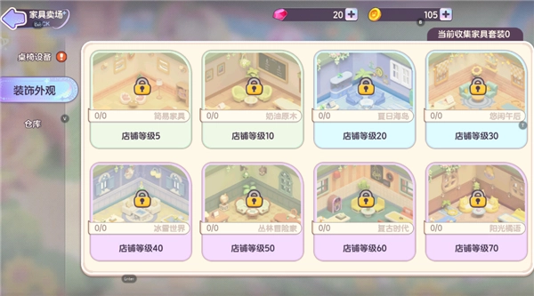 游戏里设有经验值系统,经验累积到一定程度就能提升等级,解锁更多样式各异的家具。玩家可以将这些家具布置在店内,以此来提升店铺的各项属性数值。