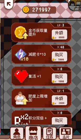 商店里售卖各式各样的道具,像金币获取效率提升、减肥卡、复活次数增加这类都十分实用。