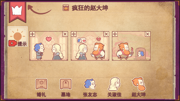 只要顺利通过第二个章节里“意气用事”这一关,你就能获得七个皇冠了。那这关具体该怎么过呢?首先要进入“意气用事”关卡,剧情会围绕疯狂的赵大坤展开,你需要把婚礼拖到第一个框里,接着再把张志友和关淑佳也拖进去就行啦。