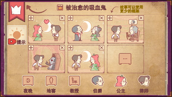 第五步将夜晚拖入第五个框内,接着把律师拖进去,再把公主也拖进去,如此一来,吸血鬼公主就被治愈了!