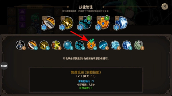 3、进入技能管理界面后,选择需要的技能进行装备;装备过程中要留意技能的具体效果,像免疫伤害这类特性,合理搭配不同技能能够有效增强战斗能力。