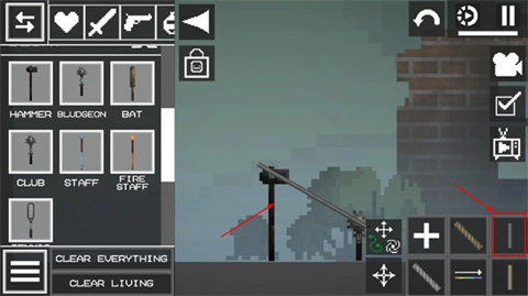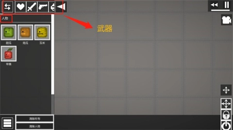 2、进入游戏后,界面如示例图所示,点击左上角的菜单按钮,在地面上添加两个物品。