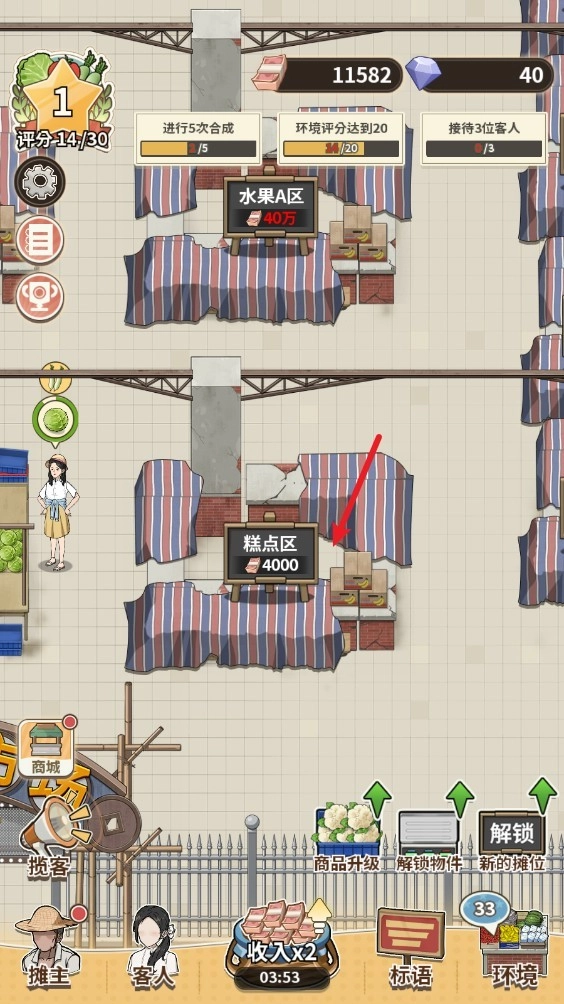 2、市场内各区域划分清晰,初期只能使用蔬菜摊位,之后要靠金币逐步解锁其他区域;每个新增摊位都得安排对应的摊主,摊主的销售能力会对整体收入产生影响。