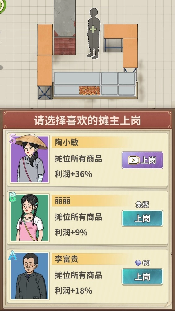 2、新摊位开业后,需招聘一名摊主,摊主等级越高,所能获得的收益就越丰厚。