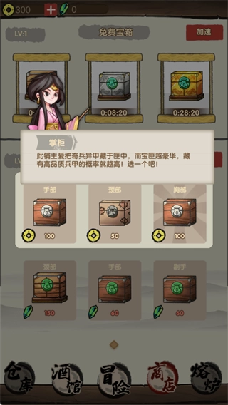 在江湖客栈的商店里,掌柜为你备好了各式各样的宝箱,里面藏着头盔、武器、护甲等稀有装备。宝箱的品质越好,开出神兵利器的几率就越高!不管是金币还是绿宝石都能用来兑换,而且还有定时刷新的免费宝箱,每天登录就能领取,福利多多,不氪金也能变得强大!