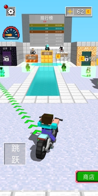 1.以3d像素方块构建的摩托车竞技闯关玩法,完美融合复古视觉风格与现代竞速体验