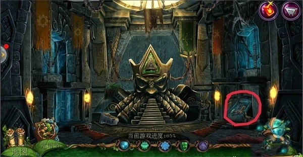 2、点击左边场景【哥布林房间】,点击中间下面的齿轮;在齿轮旁边拿到【铁链】;用【八边形钥匙】打开机关,在地上拿到【镰刀】。