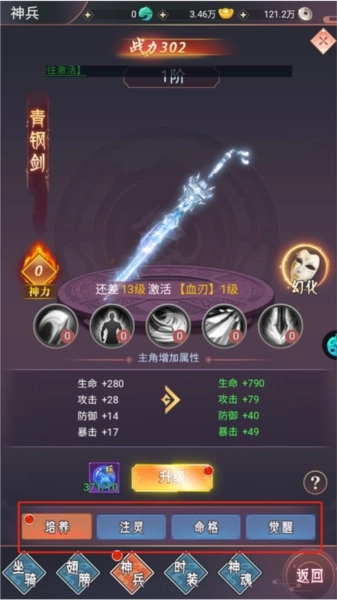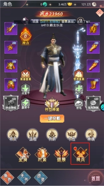 2、在角色界面下方有一个神兵按钮,点击进入;