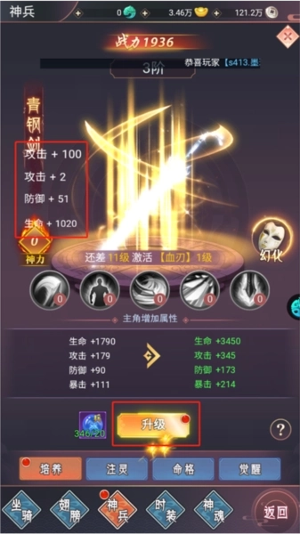 4、升级需要消耗对应的材料,点击升级即可提升玩家角色的一些属性。