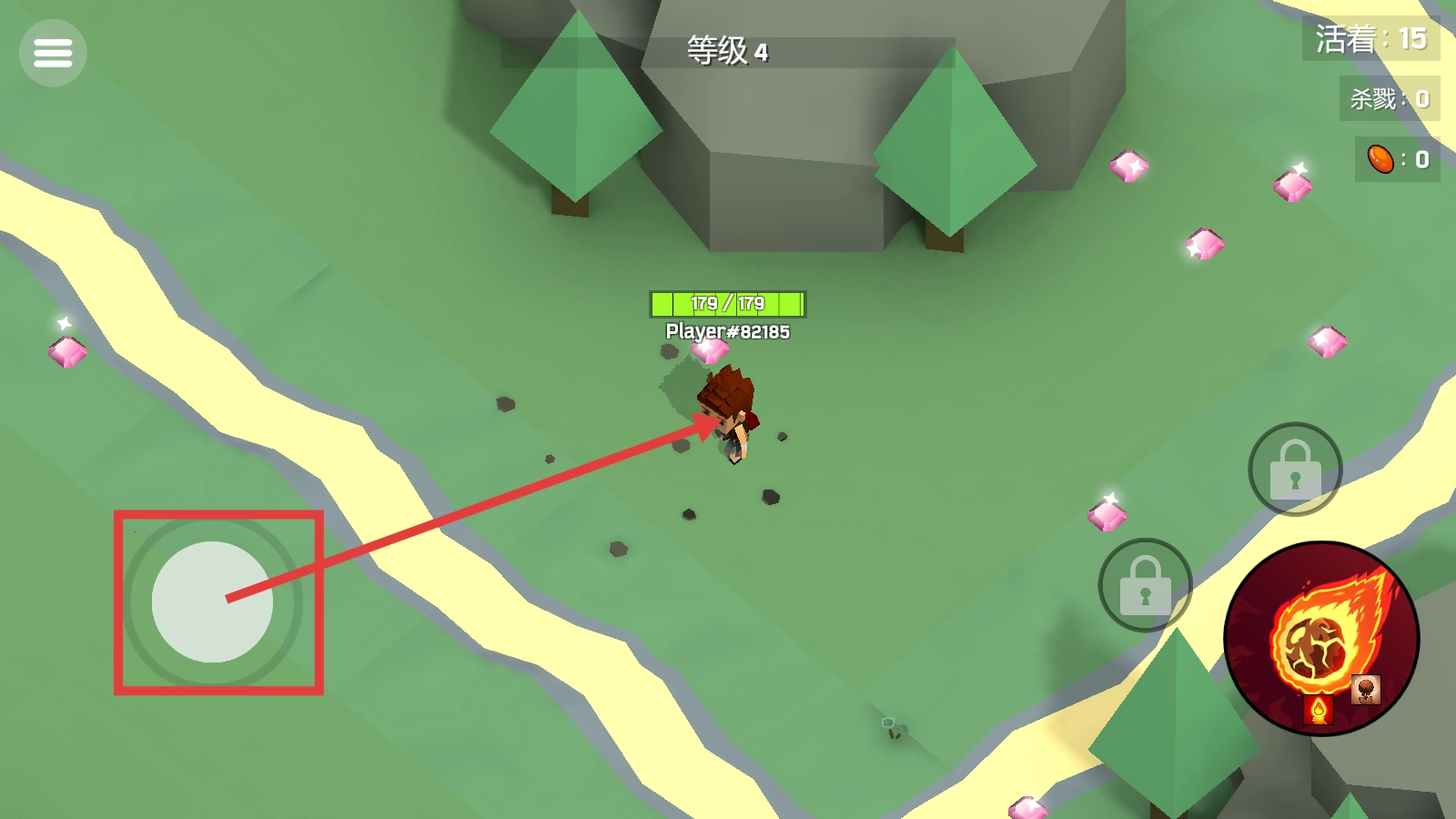 通过左侧摇杆操控角色移动,在4级地图里收集粉色宝石,留意“活着”与“杀戮”的计数情况,同时熟悉地图的环境布局。