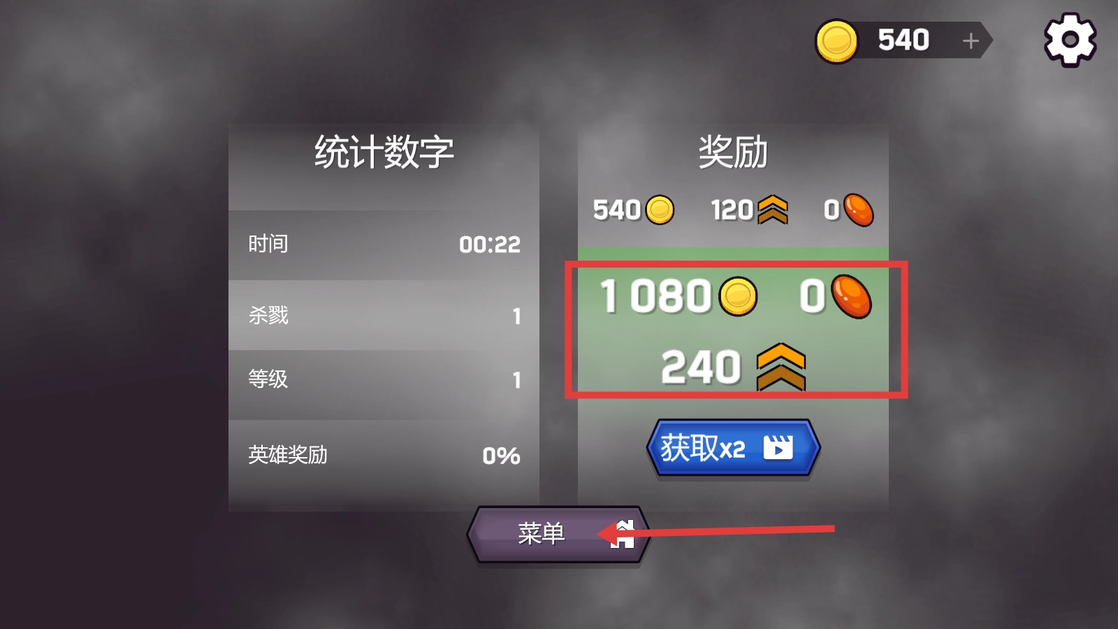 战斗结束后,可领取1080金币与240等级资源,点击“菜单”按钮返回主界面,通过积累资源来提升角色战力。